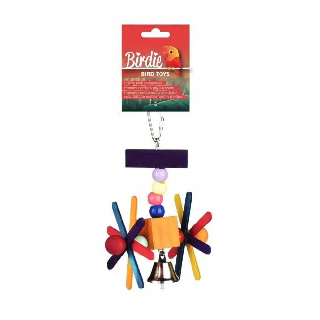 Birdie toys are fun and engaging, and this one is no different. It has a variety of different materials and textures, plastic beads, wooden blocks, a bell and the two Popsicle stick fans on each side of this toy which spin freely. Great for small birds who love to chew!