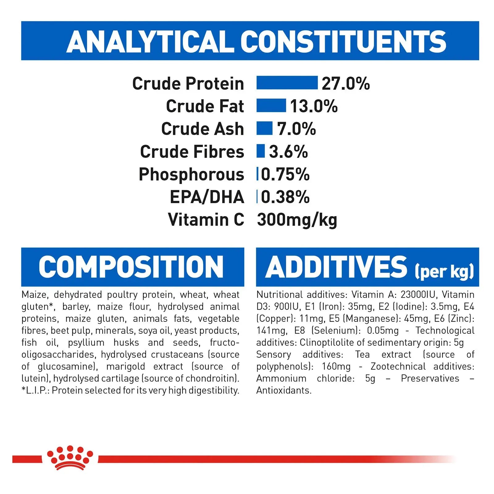 Ingredients: maize, dehydrated poultry protein, barley, maize flour, wheat, vegetable protein isolate, animal fats, maize gluten, hydrolysed animal proteins, vegetable fibres, beet pulp, minerals, soya oil, yeasts and parts thereof, fish oil, fructo-oligo-saccharides, psyllium husks and seeds, hydrolysed crustaceans (source of glucosamine), marigold extract (source of lutein), hydrolysed cartilage (source of chondroitin).